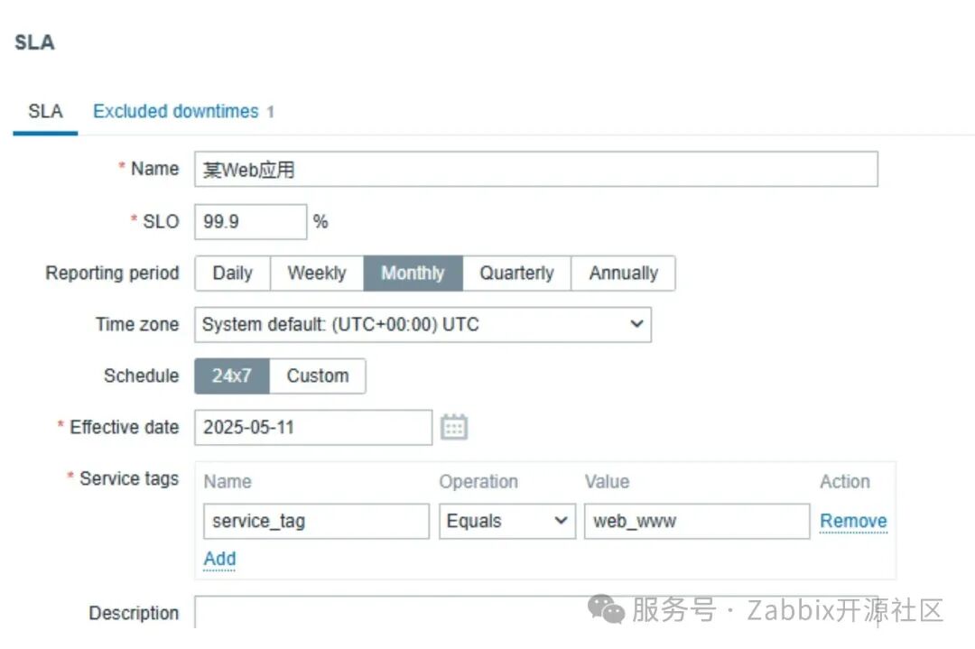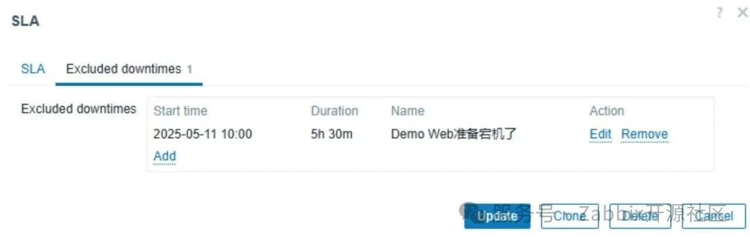 如果碰上系统、应用、电力等因素而不得不导致SLA受影响,但我们允许Zabbix里的SLA保持不变,可以按下面两个方法之一来设置: