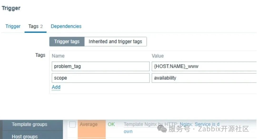 (如上图所示,我给Nginx: Service is down的Trigger新建了一个名字是problem_tag,值是{HOST.NAME}_www的新Tag。)