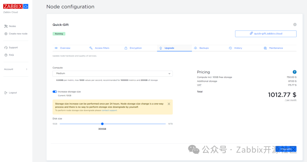 磁盘利用率也可以从节点配置部分的升级标签页增加。请注意,一旦增加了 Zabbix Cloud 节点的存储空间,将无法减少!