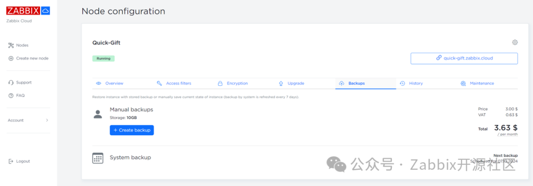 手动备份可以从节点配置部分的备份标签页执行。在这里,还可以看到下一次预定的自动备份,并从现有备份恢复 Zabbix Cloud 节点。目前,Zabbix Cloud 节点备份无法从 Zabbix Cloud 导出,现有的 Zabbix 实例无法迁移到 Zabbix Cloud。