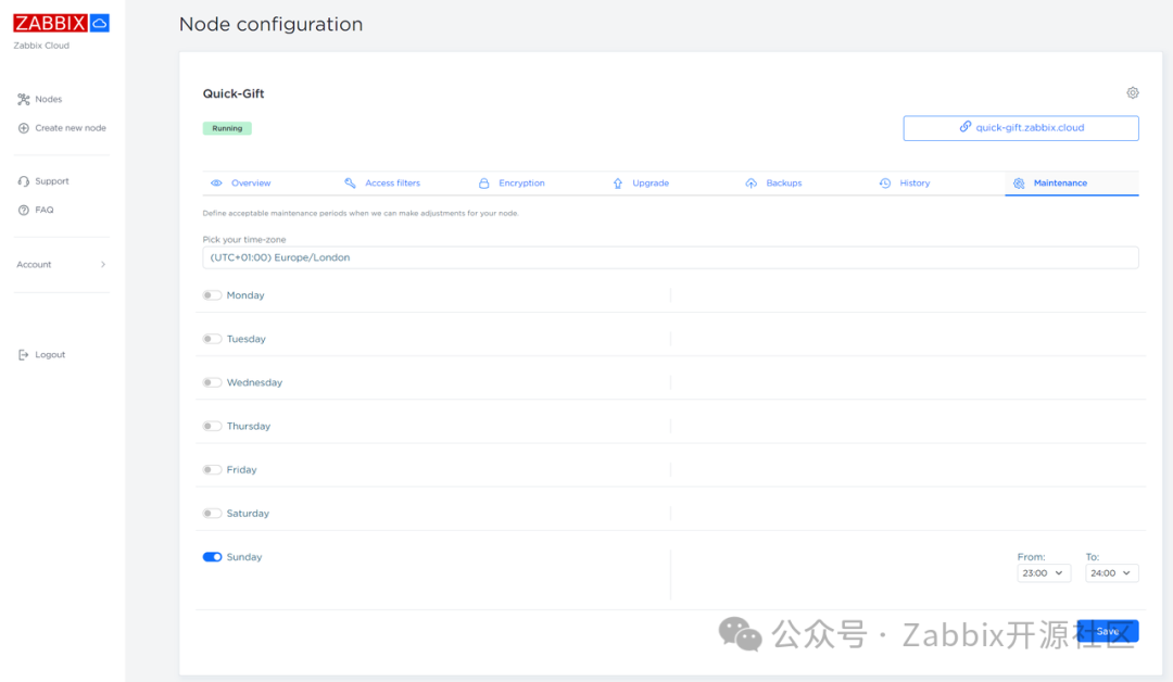 使用 Zabbix Cloud,将自动升级到最新的次要或主要版本。一旦最新的 Zabbix 版本通过了 Zabbix Cloud 部署的内部测试和 QA,你的 Zabbix Cloud 实例将在节点配置部分选择的每周维护期间自动升级到最新版本。
