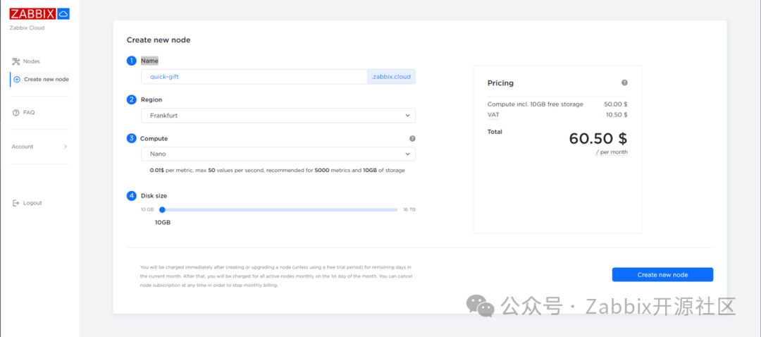 部署 Zabbix Cloud 节点只需点击几下即可完成。只需单击“创建新节点”按钮,给你的节点命名,并选择区域、计算资源级别和磁盘大小。节点部署完成后,可以通过其 DNS 名称和提供的管理员帐户登录凭据访问 Cloud Zabbix 实例。
