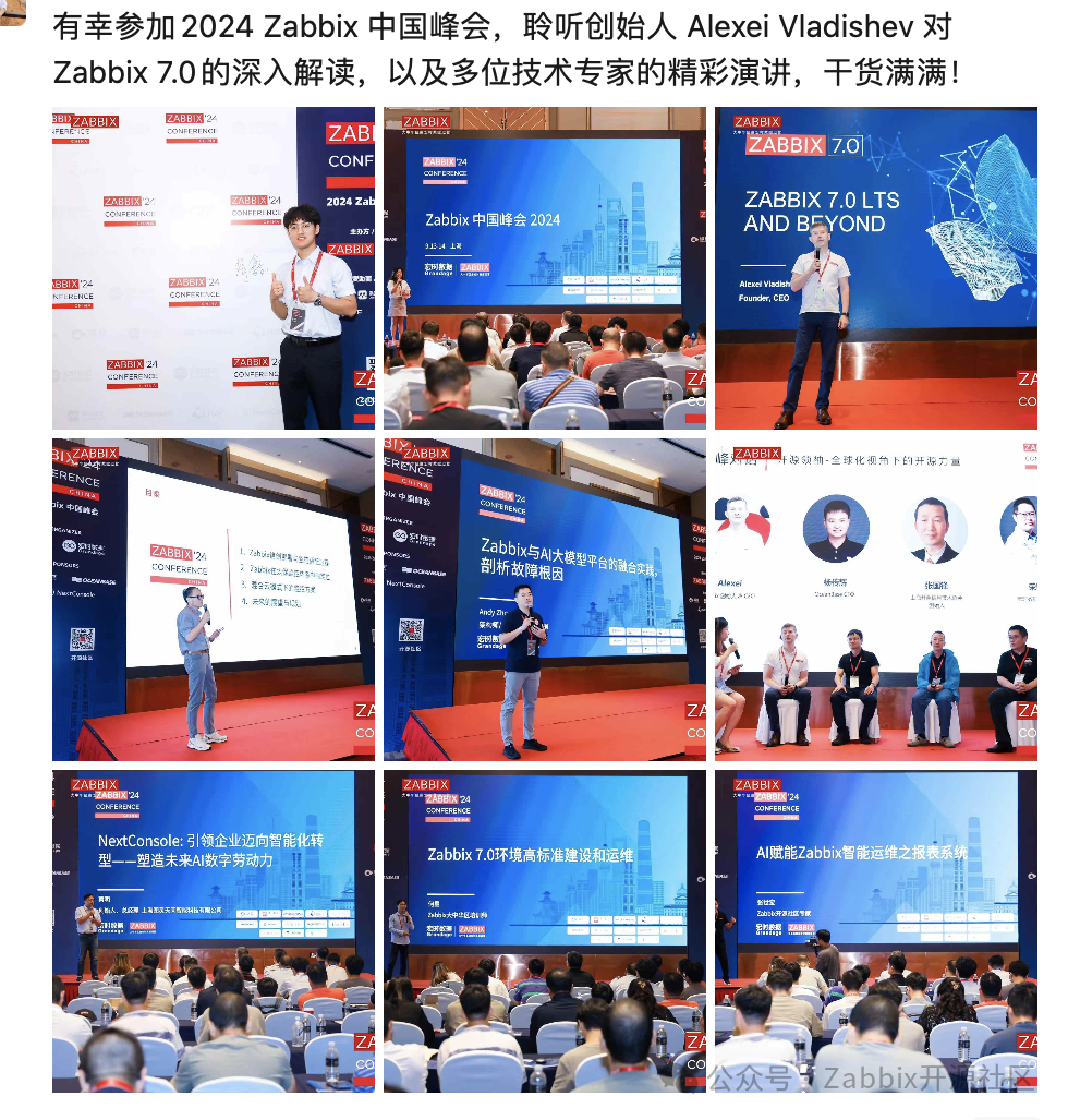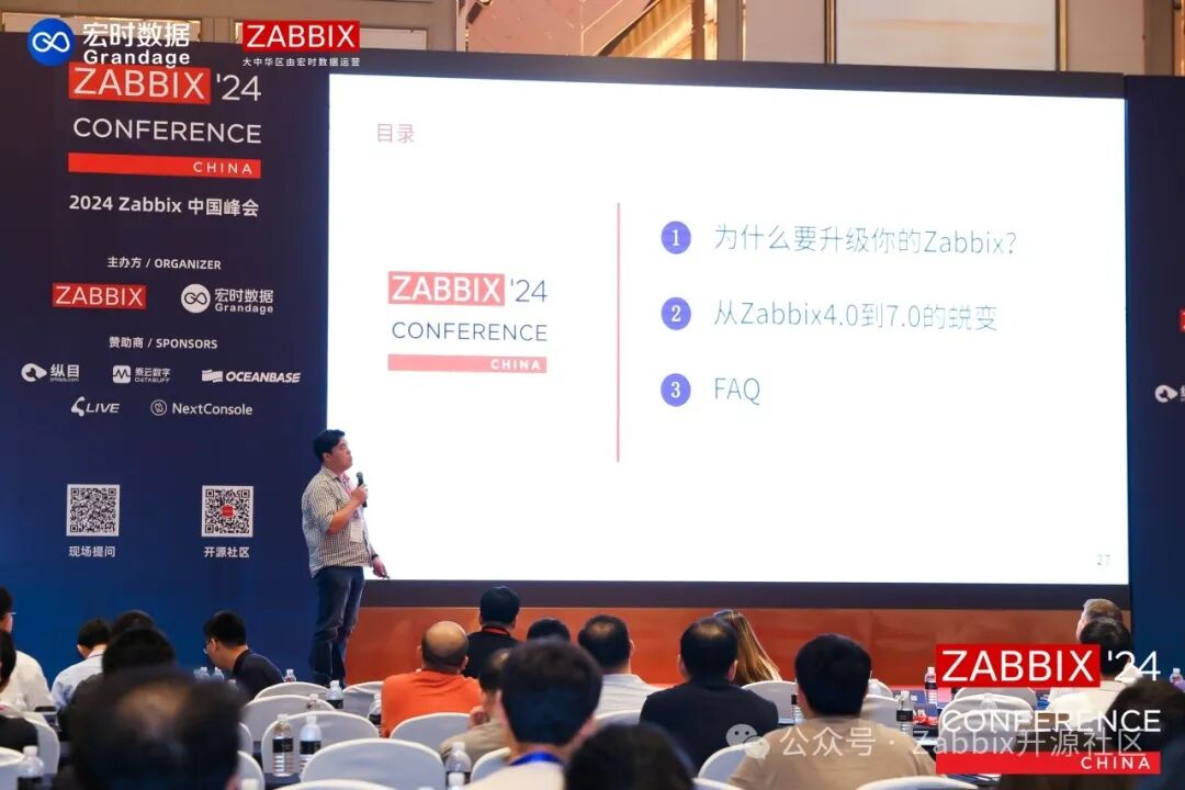 开源社区代表张国帆带来《Zabbix在传统制造业中的应用》演讲、Zabbix高级认证工程师张宇带来《Zabbix proxy 7.0 数据缓存新特性》演讲、董玉凡带来《Zabbix 性能调优三板斧》演讲、夏振清带来《Zabbix 4.0到7.0的升级之路》演讲、7.0译者程哲带来《Zabbix 在私有云环境下的监控实践》演讲。