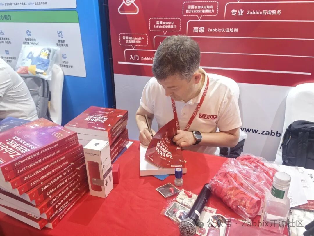 峰会现场, 来自全国各地的Zabbix用户与Alexei面对面交流、互动提问、合影等。Alexei在峰会现场为Zabbix中国工具书籍签名,希望这些书籍、中文手册等学习资料能帮助到更多的中国用户。