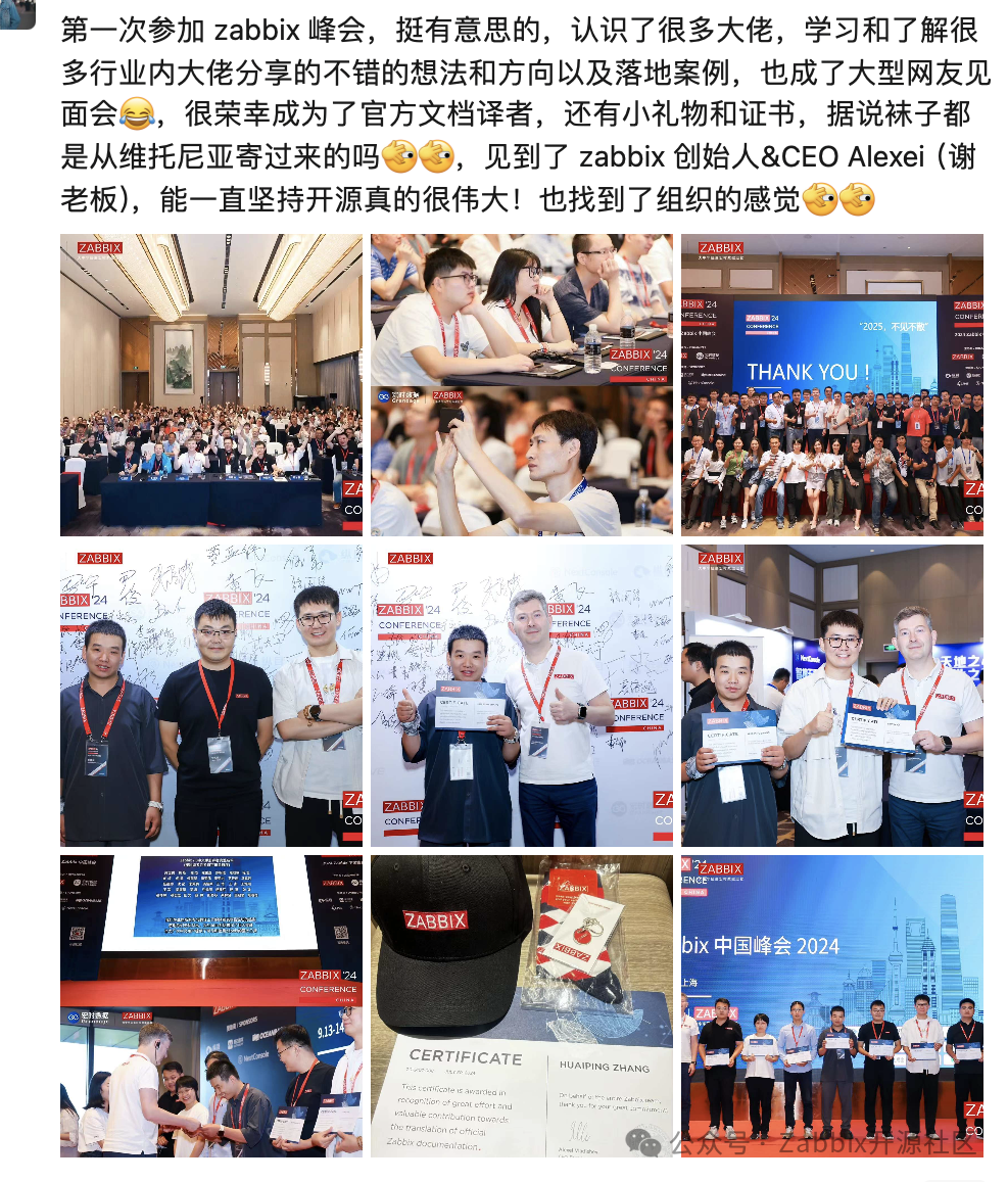部分7.0中文手册译者也出席了本次峰会活动,现场与Alexei和技术专家们进行面对面交流、合影,讲述自己使用Zabbix 的心路历程,度过了难忘的一天。活动当天未能到场参与的译者代表们也发来视频问候,感谢所有7.0中文手册译者的无私付出。