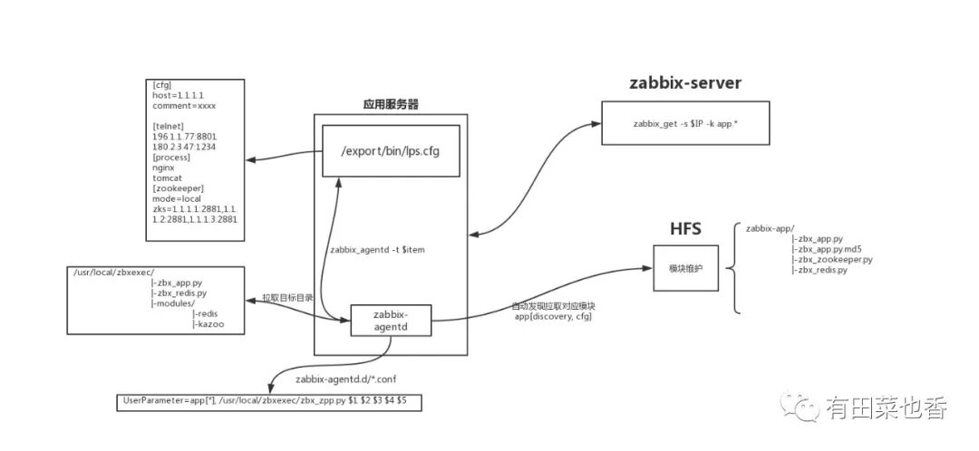 Zabbix Proxy 会调用 Discovery APP 自动发现,触发主机初始化一次当前的 zbx_app 基类,基类收到信号后也会扫描环境,主要是收集各目录下的声明文件(lps.cfg),并根据声明文件做一次基础环境配置拉取,然后返回 Zabbix Proxy 相关信息。