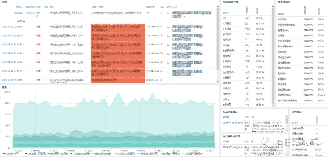 当有了强大的应用监控框架支撑后,运维人员也开始更往上地关注更上层的业务监控,业务的特征也是整套架构运行稳定的最直白表现。Zabbix 提供了数据库的监控,直接在网页界面直接编写 SQL 语句,由 Proxy/Server 通过 unixodbc 加载对应驱动去连接目标数据库,最终返回执行结果。目前我们利用这种方法,对业务的状态信息、交易成功率、设备报活、跑批等进行数据库查询,再通过 Zabbix 的告警渠道发送告警信息给全行订阅了这个业务系统的技术人员。直接在网页界面编写 SQL 能够适应业务查询的多变性,当受监控业务新增一个子系统时,仅需要在其监控项里连接一个新表,不需要修改自定义脚本。另外,这种方法可以降低自定义脚本的维护成本,ODBC 提供了多种数据库的驱动,在网页端开来底层一切都是封装好的,没有必要去考虑连接如何初始化、怎么建立游标、合适释放会话等。当获取到各个业务的监控数据后,能够平滑地对接到 Zabbix 的 dashboard,为各个业务创建一个监控面板,实现大屏展示的效果。