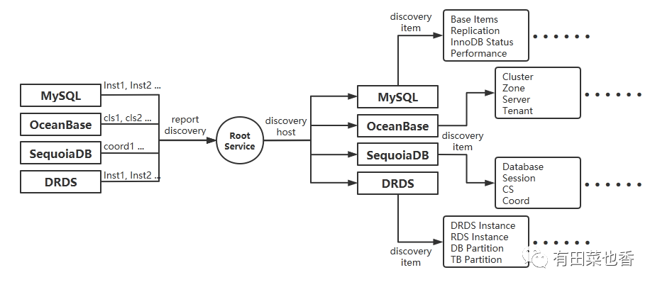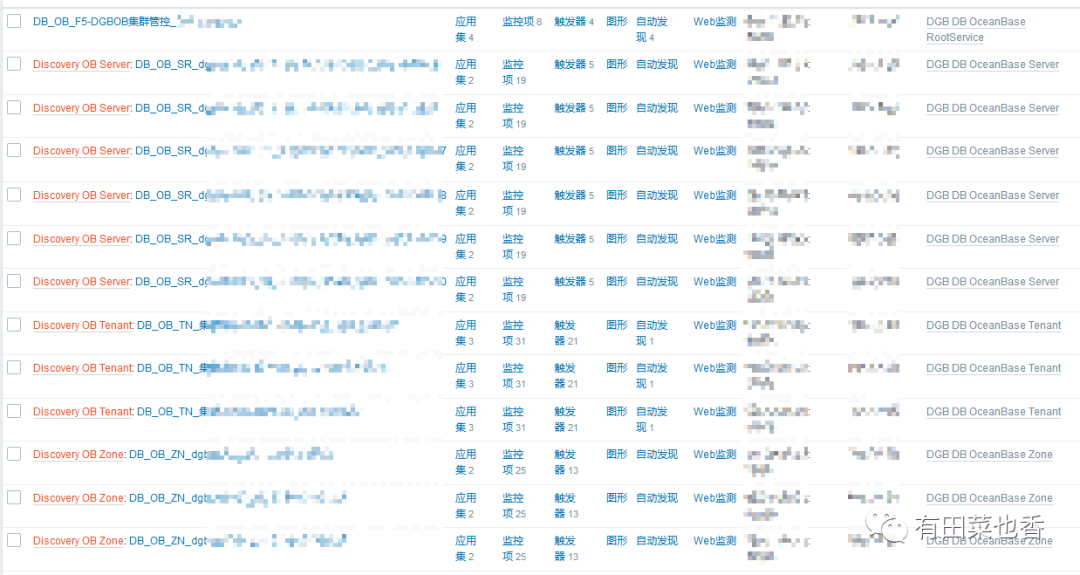 创建一台逻辑主机作为主控服务,以链式发散的传播模式自动注册主机,然后根据模板内的自动发现判断是否需要附加额外的监控配置,这种在我们创新使用的监控方法,取到了非常好的成效,让监控系统变得更加智能,也不用像某些数据库监控还需要将连接的用户与密码写入到 Zabbix 的宏,而只要保证读取的配置文件在文件系统的 ACL 上是最小权限即可,提高了数据库的访问安全。另外一点,现在很多的分布式数据库也是采用 控制+计算+存储 的架构,例如 TiDB 的 PD 负责元数据管理、DB 负责 SQL 解析与计算、KV 负责底层键值对存储,面对众多的分区也好,副本也罢,最有效的监控方式就是直接对接其管控部件,将 Zabbix 主控服务的起点映射至数据库集群的管控上,不断顺着架构分层,将各个组件之间的监控项固化成自动发现规则,实现精准有效的监控覆盖。以目前我们的 OceanBase 分布式数据库监控为例,以下从 OB RootService 自动发散出 OB Zone、OB Tenant、OB Server、OB Partition 等监控细节。