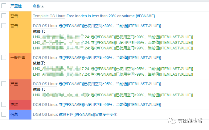 首先,将模板细分为各个类别作为基类的 template,然后根据应用场景来指定上层的模板由哪些基类组合,避免太多的定制模板中近似功能的监控带来重复监控。然后,对每个模板中的触发器指定严格的依赖关系,避免告警的连带触发导致风暴。例如 Linux 系统的分区容量监控触发器,我们制定了几个水位线之间的依赖: