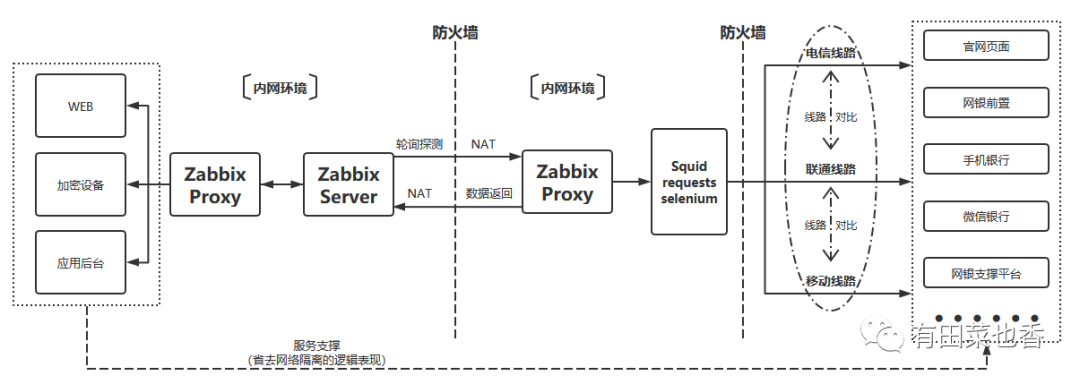 我们使用 Zabbix Web 的监控方式,通过防火墙和 NAT 的网络隔离,使用 Squid 实现线路选择,以及运用 selenium 等自动化工具进行页面动作模拟,实现了网银系统的内外网、运营商线路层面的监控。