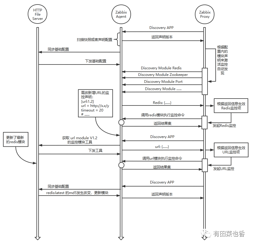 此框架的内部原理,主要是通过 Zabbix 发送来特定的监控项和自动发现作为更新配置与自动检查基础环境的信号,如果发现文件服务器的相关模块版本更新则会主动拉取文件,从而实现自管理的操作。这个接收特定信号并管理自身的环境的模块我们内部称之为基类,所有的模块监控会有一个自动发现规则与基类交互,如果基类声明文件里包含了请求的自动发现模块,那么就会应答,让 Zabbix 感知并利用返回的结果来生成此模块的监控项。对应的监控项生成后,每个监控项会使用快照的方法去捕获一次监控目标,然后再由监控相关项来拆分同一时间点上的各个子项。在这个调用的阶段,也是与基类交互的,只不过基类会根据其模块名来调用同步过来的模块方法的固定接口,这些接口是编写这类模块的开发准则,目的是为了保证基类能够顺利调用并解析。