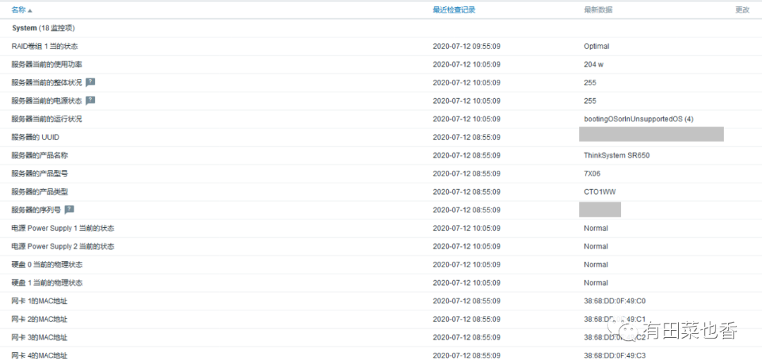 discovery[{#SNMPVALUE},OID] 函数来完成,无缝对接到内部通用的自动发现数据结构。整个 SNMP 自动发现的机制原理如下由于我们 Zabbix 的起步试点是从基础设施运维开始,加上 Zabbix 对 SNMP/IPMI 协议配置的操作非常方便,所以经常可以根据厂家提供的 mib 文件及 mib 文档说明即可筛选出需要自定义的监控,这样既可以通过减少采集来降低管理系统的繁忙度,又能优化监控质量。例如以下为根据 Lenovo XCC 带外管理系统的 mib 说明(http://www.circitor.fr/Mibs/Html/L/LENOVO-XCC-MIB.php)来自定义配置的 ThinkSystem SR650 的 SNMPv3 监控使用效果: