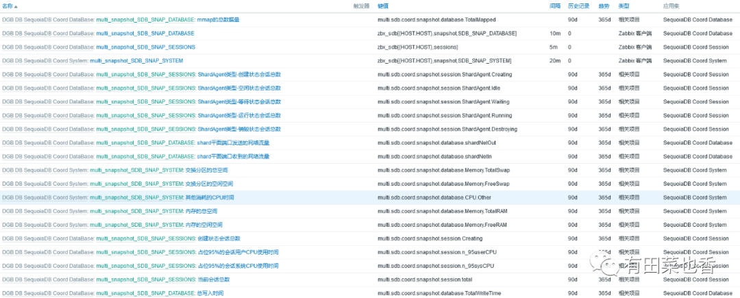 multi_snapshot_SDB_SNAP_* 开头的,其余的都是由这三个监控项派生出来的,也就表示交互次数可以从 56 次缩减到 3 次。我们对这种方案的实施,是通过自定义脚本或 LDD macros 来生成一个包含各个子监控项的 JSON,并设置为不保存历史记录,这一点非常重要,因为子监控项的生成是在父监控项转储前计算得到的,保存大量被拆分的冗余 JSON 字符串也没有实际意义。在子监控项的生成动作中,主要使用了 Zabbix 监控项的预处理操作,使用 JSONPath 将对应的 K/V 抽出,再通过倍数/每秒变更/正则等方式获取到最终的子监控值。虽然预处理会消耗 Zabbix 的 CPU,但是实测调大 StartPreprocessors 参数后,CPU 没有明显的攀升,而且 Zabbix Proxy 是分布式可扩展的,这种瓶颈也非常容易通过扩容来解决。综合评估下来,这种方案带来的回报是很可观的,当出现数据库问题时,或许更多的 DBA 希望回溯监控历史,能够看到的是这样同一时间平面上的各项指标:应用监控