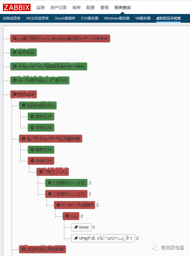 除此,还有每日一更的容量清单、硬件信息、巡检报告等。就如其中一个 VMware 虚拟机互斥检查为例,其通过树形图的形式,展示出每个业务系统的应用模块中,判断冗余节点是否部署在相错的资源(ESXi 或 LUN 或 Cluster)上的,这样方便虚拟机管理员分离关联虚拟机,降低发生 HA 时受影响的系统模块,也能够保应用证同城灾备的建设是否符合预期。