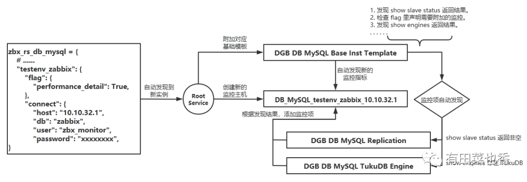 在 MySQL 实例的配置 zbx_mysql.py 文件中,新增一个 testenv_zabbix 的数据库实例,这份文件是通过 acl 设置仅为 zabbix 用户读取的。当作为 MySQL RootService 的主机执行自动发现主机的监控时,会将新增的实例配置生成 Zabbix 自动发现的 json 规则,根据配置信息创建监控实例,并附加使用 MySQL 基础模板。在 MySQL 基础模板中,配置了一系列特殊的监控自动发现规则,例如 Discovery MySQL Replication Enable 会对发现的实例执行