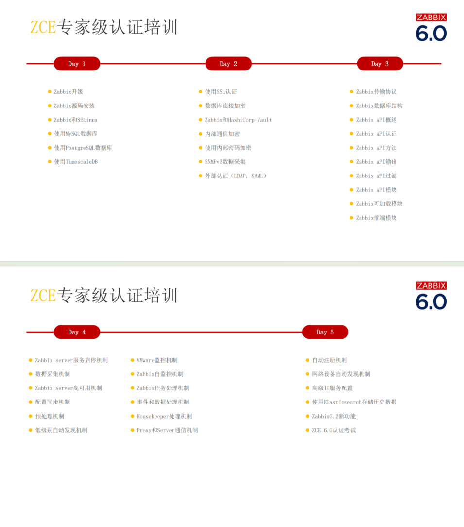 ZCE是目前Zabbix用户认证培训的最高级别,教授API, HA/DR, 数据库分区方面的专业知识,为企业高级技术管理人员设计和维护高效率高负载的监控环境提供知识支撑。